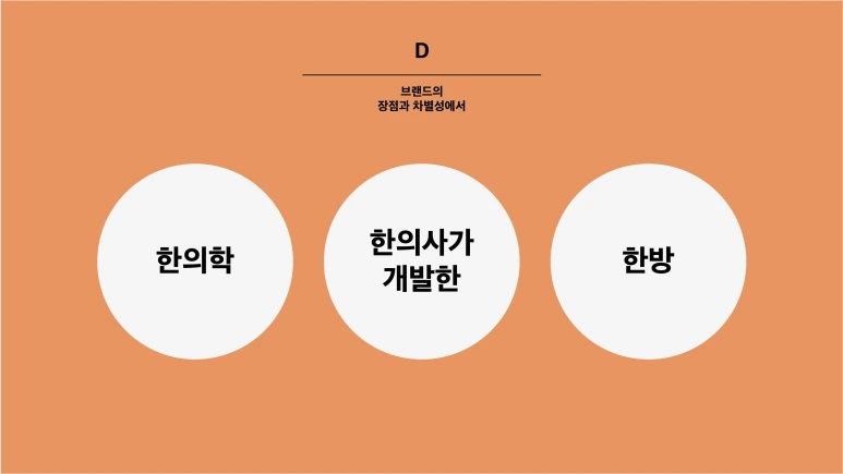 마지막으로 프레임 워크 중 가장 하단에 있는 브랜드의 장점과 차별성은 결국 '한방', '한의학', '한의사가 개발한' 건기식이라는 데 있습니다.