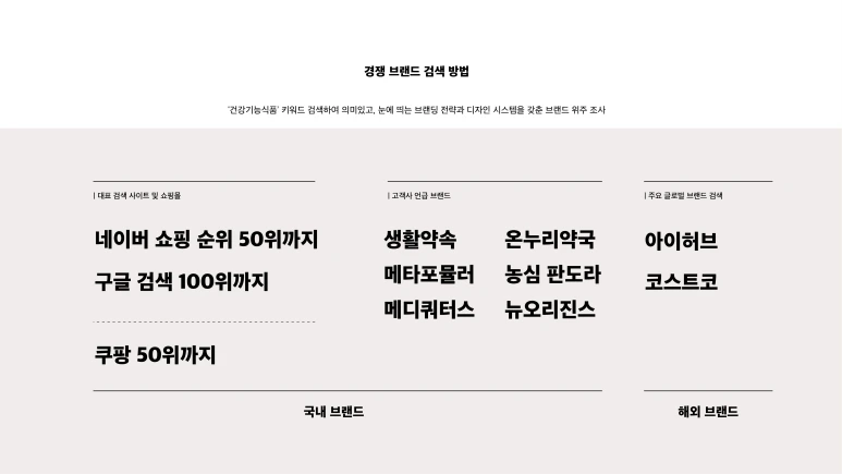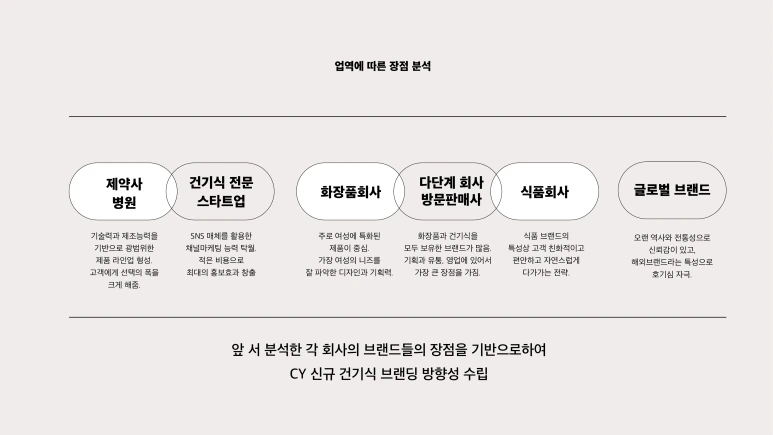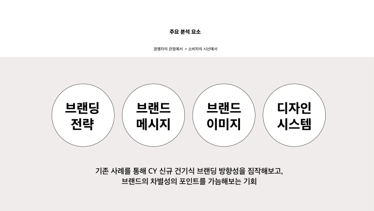 경쟁 브랜드를 살펴보면서 그들의 브랜딩 전략, 메시지와 이미지를 활용하는 방법, 디자인 시스템 등을 유심히 살피면서 그들과 비교해 우리 CY 건기식의 차별화 포인트를 찾아내는 기회가 됐으면 합니다.