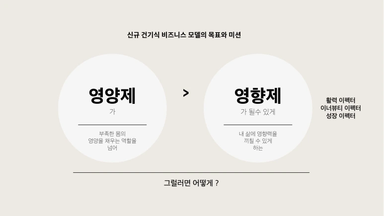 그리고 이번 CY의 건기식 브랜드의 미션은 부족한 몸의 영양을 채우는 '영양제'가 아니라, 우리 삶과 건강에 영향력을 끼칠 수 있는 '영향제'가 되어야 한다고 생각합니다.