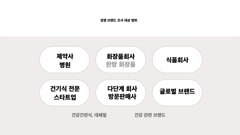 우선 건기식 경쟁 브랜드의 범위는 어떻게 정해야 할까요? 건기식을 판매하는 기업별로 총 6가지로 구분이 가능할 것 같습니다. 제약사나 병원에서 만드는 브랜드, 화장품 회사의 브랜드, 식품 회사의 브랜드, 건기식 전문 스타트업 브랜드, 다단계 / 방문 판매사 브랜드, 글로벌 브랜드들로 나눠 생각해 볼 수 있습니다.