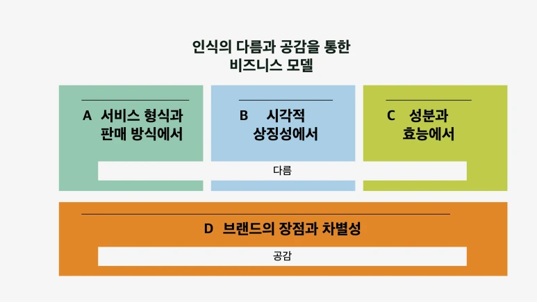 이 프레임 워크는 브랜드의 장점과 차별성 즉 '공감'을 기반으로 서비스 형식과 판매 방식, 시각적인 상징성, 성분과 효능의 '다름'을 발견하며 브랜드의 방향성을 정리해나가야 할 것입니다.