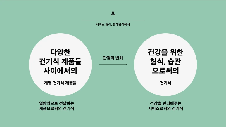 먼저 서비스 형식과 판매 방식에 있어서는 일방적으로, 단편적으로 전달하는 제품으로서의 건기식이 아니라, 내 건강을 관리해 주는 서비스로서의 건기식이라는 관점의 변화를 가져와야 하겠습니다.