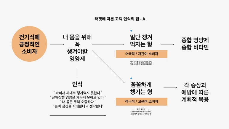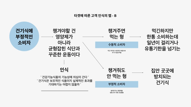 그런 이유에서 타깃에 따른 고객 인식 맵을 그려봤습니다. 건기식에 긍정적인 소비자, 부정적인 소비자의 입장에서 생각하는 건기식에 대한 인식의 과정을 그려보면서 그 과정 사이에서 어떤 문제점을 극복해가야 하는지, 어떤 기회를 발견할 수 있는지를 살펴볼 것입니다.