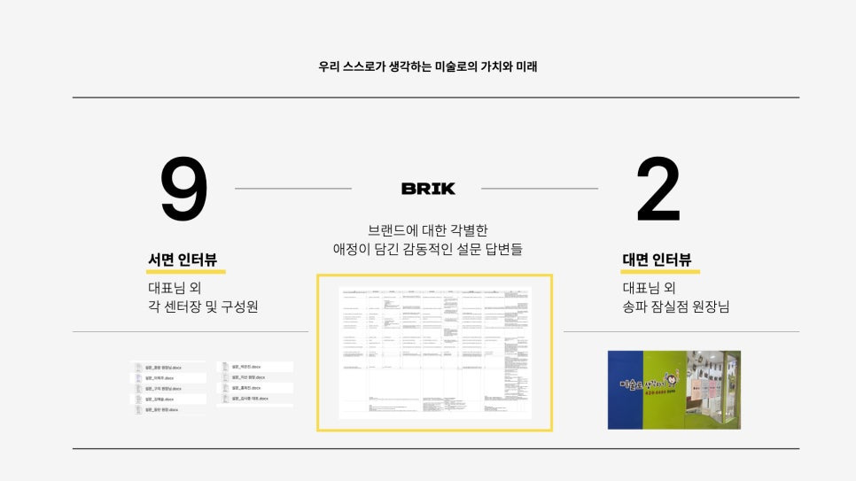 대표님과 임원진 대면 인터뷰, 아홉분의 서면 인터뷰로 설문을 진행했습니다. 설문에 대한 답변을 읽는 내내 감동이었습니다. <미술로생각하기>라는 브랜드에 대한 각별한 애정이 답변 사이 사이에 묻어나 있었습니다. 이 브랜드가 고객들에 오래도록 사랑받아 온 이유를 알 수 있었습니다. 10년이 넘게 운영하시는 장기 운영자들이 많은 점도 이해가 갔습니다. 현장의 다양한 의견들 덕분에 브랜드 컨셉의 아이디어와 맥락을 세밀하게 잡아갈 수 있었습니다. 어떤 마음과 어떤 생각으로 이 브랜드를 경영하고 아이들을 가르치고 있는지 알 수 있어서 브랜드 추구해 가야할 변함없는 가치의 방향성을 잡는데 큰 도움을 줬습니다.