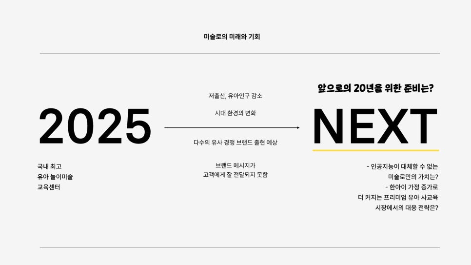 <미술로생각하기>는 1999년부터 줄 곧 '놀이 미술'이라는 장르에서 굳건한 1위 자리를 지켜왔습니다. 하지만 그것도 벌써 20년이 넘는 세월을 지나왔습니다. 그 사이 사회 문화적, 기술적 환경도 많이 변했습니다. 다수의 유사 경쟁 브랜드도 출현했고, 저출산으로 유아 인구가 감소하고 있습니다. 20년 전에는 굉장히 신선했던 놀이 미술이라는 교육 프로그램도 더 이상 새롭지 않습니다.