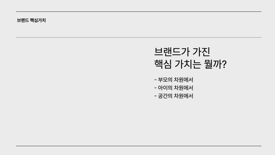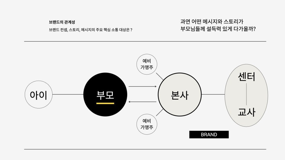 브랜드의 핵심가치를 생각하면서 부모와 아이, 교사, 공간에 대해 생각하지 않을 수 없었습니다. 영유아 브랜드의 특수성에서 오는 어쩌면 고객이 두명(부모와 아이)라는 조건을 생각해봤을 때 꼭 필요하다고 판단했습니다.
