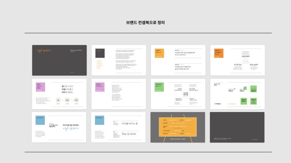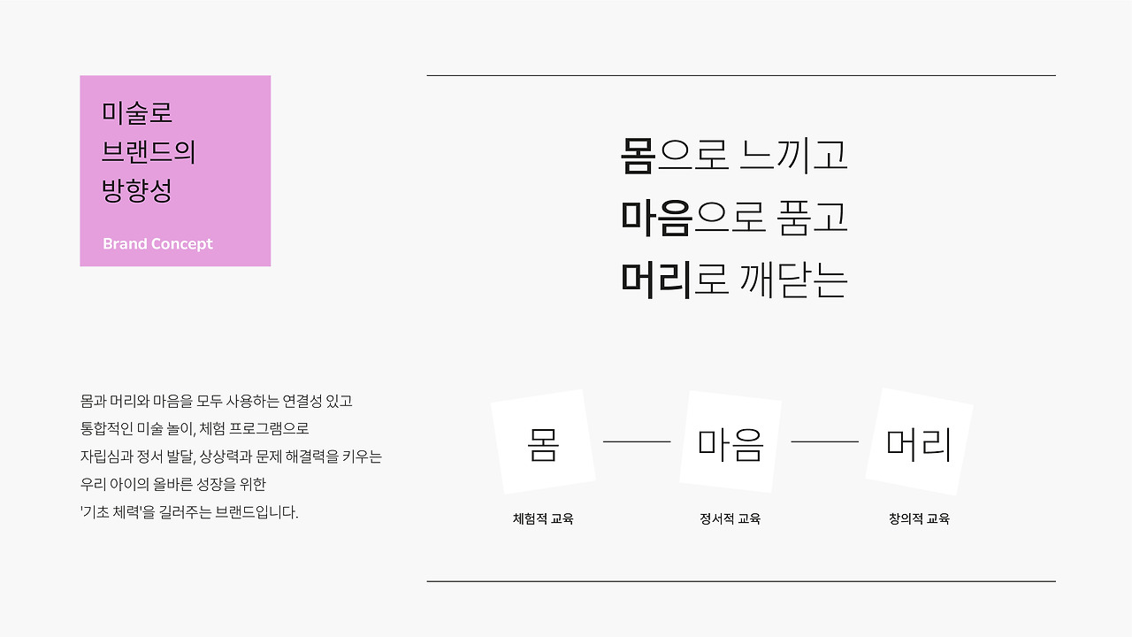 위와 같이 만들어진 '몸-마음-머리'라는 <미술로생각하기>의 컨셉은 아래와 같은 열두페이지의 브랜드 컨셉북으로 정리됐습니다.