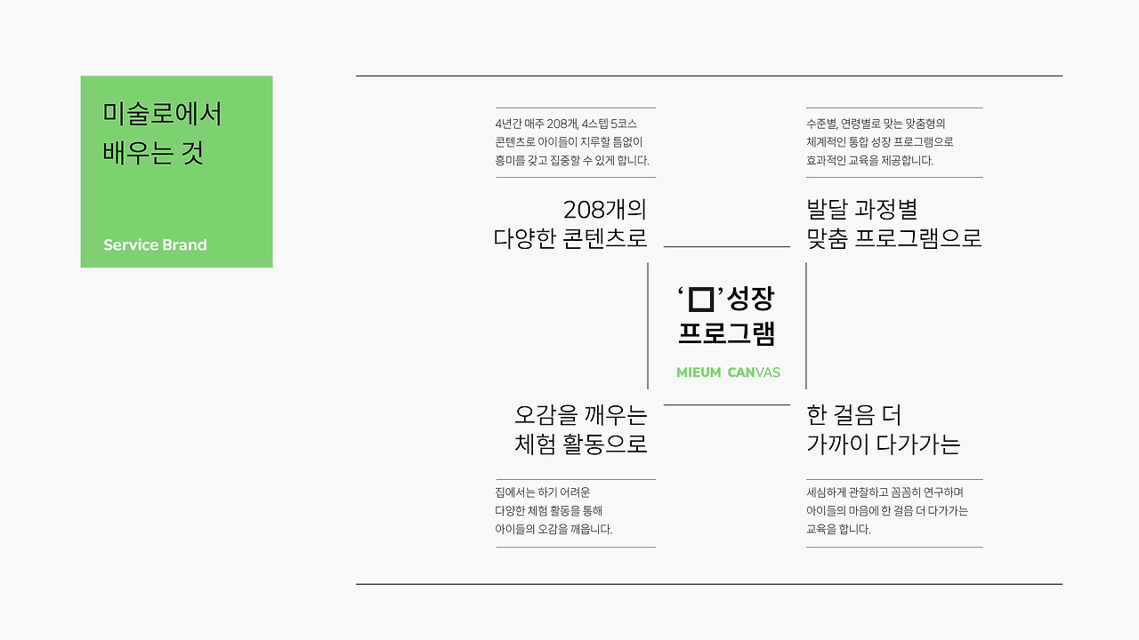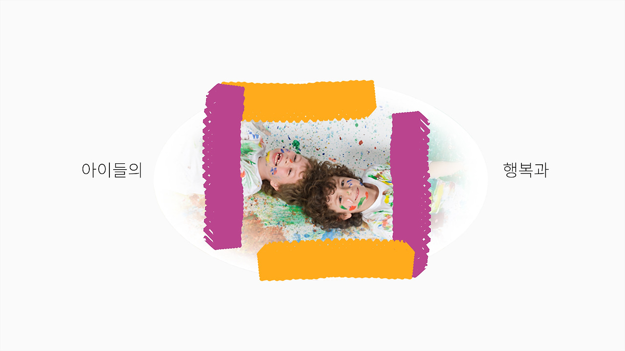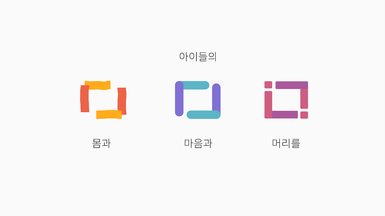 이렇게 아이들의 몸과 마음과 머리를 하나로 연결하고 통합되게 하는 교육서비스 - 전혀 다른 관점으로 아이의 성장 잠재력을 깨우는, 아이의 행복과 꿈을 채워나가는 곳 - 놀이 미술 성장 프레임 <미술로생각하기>라는 브랜드 스토리를 시각적으로 풀어냈습니다.