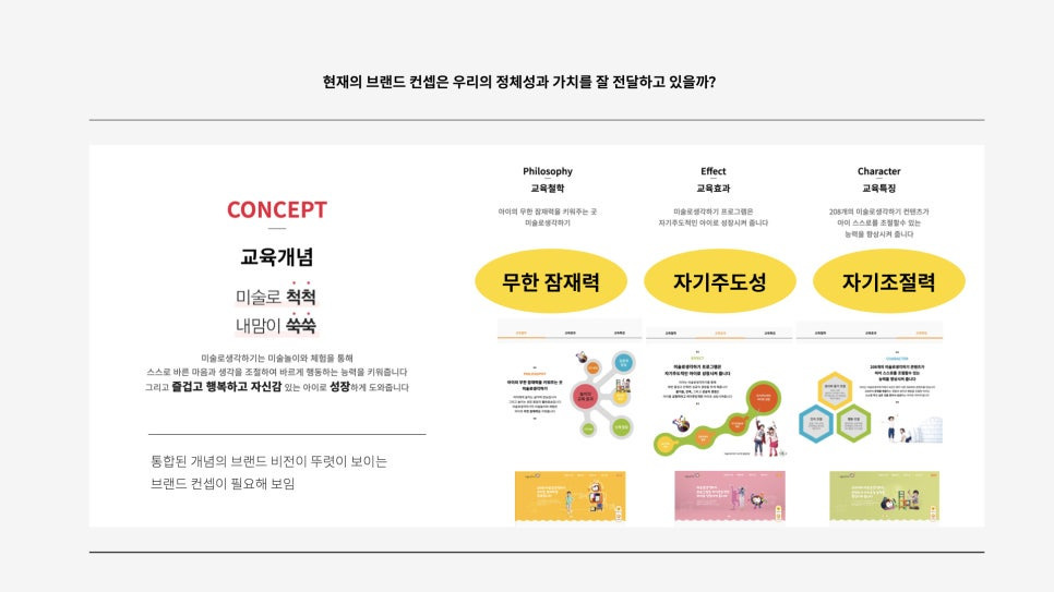 브랜드 컨셉 도출에 앞 서 현재의 브랜드 컨셉에 대해 살펴보겠습니다. '미술로 척척, 내맘이 쑥쑥'을 브랜드 컨셉으로 내걸로 있습니다. 브랜드가 가진 특징을 알기쉽게 정리했지만 다소 가벼운 구호나 메시지처럼 느끼지는 건 단점입니다. 브랜드 컨셉이라는 이름에 걸맞는 큰 그릇같은 이미지로 브랜드의 개념을 담아내야 했습니다.