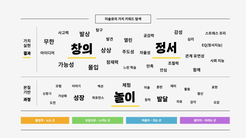 그렇게 추출한 핵심가치들을 조금 더 구체화하여 키워드를 나열하고 분류하며 <미술로생각하기>가 이루는 가치 키워드맵을 그려봤습니다. 이 키워드들은 브랜드 컨셉을 추출하는 핵심 개념들이 될 것입니다.