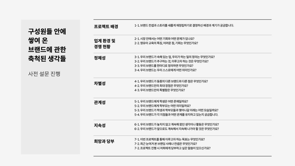 그런 이유로 처음부터 구성원들이 생각하는 브랜드의 다양한 면들을 파악하기 위해 매우 상세하고 구체적인 설문지를 설계했습니다. 브랜드의 정체성, 차별성, 관계성, 지속성에 대한 내용으로 구분해 세세하게 질문했습니다.
