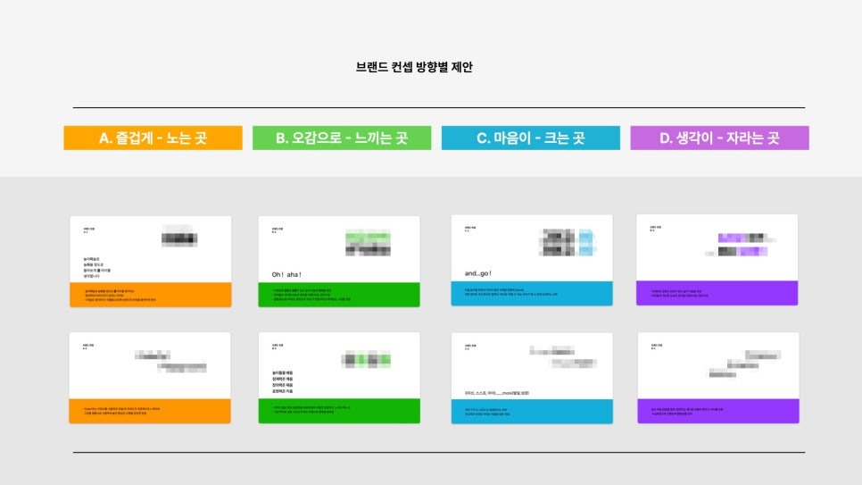 브랜드 컨셉 발상의 올바른 방향성을 설정하고 용이하게 하기 위해 먼저 즐겁게 노는 곳(놀이), 오감으로 느끼는 곳(체험), 마음이 크는 곳(정서), 생각이 자라는 곳(창의)으로 분류하며 브랜드 컨셉을 응축해 나갔습니다.