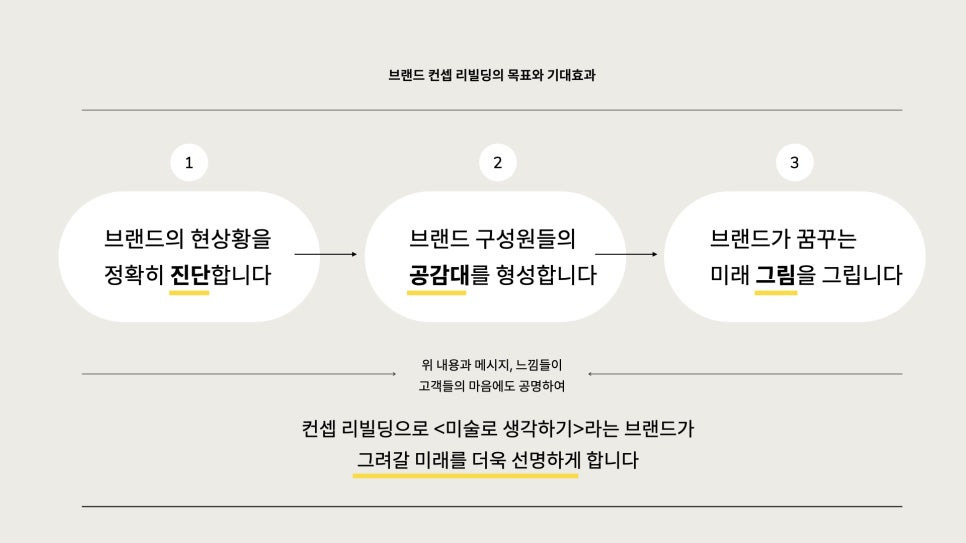 브랜드가 딱 이런 상황에 있는 경우 스스로의 '브랜드 컨셉'을 점검하고 새롭게 재정립하는 시점일 때가 많습니다. <미술로생각하기>도 바로 그런 때라는 생각을 했습니다. 브랜드 컨셉이라는 브랜드의 방향성이 제대로 잡혀야 좌측으로는 사업화를 위한 전략이 우측으로는 스타일과 시스템까지 잘 연결됩니다. 이번 브랜드 컨셉 리빌딩 과정을 통해 이뤄야할 목표입니다.