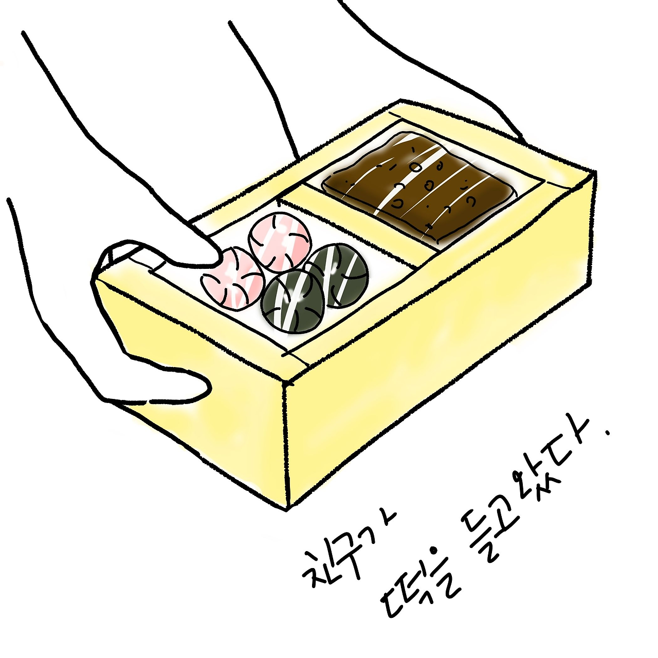 친구의 손엔 작은 돌선물 떡 같은 예쁜 상자에