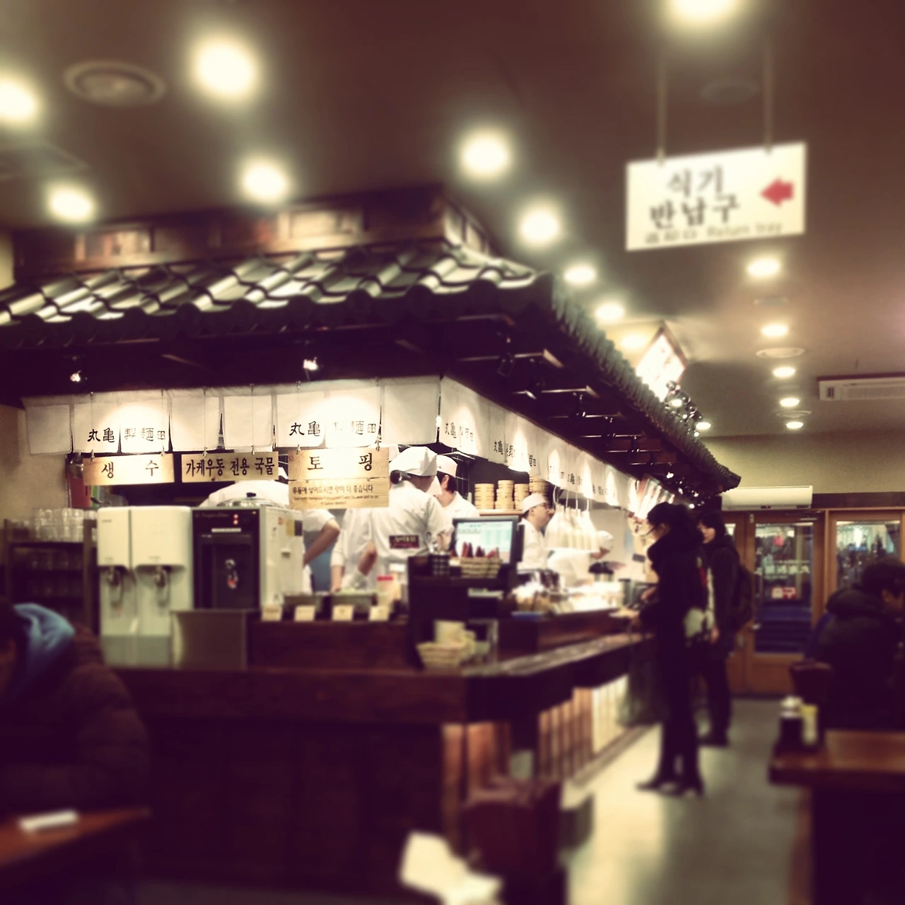 쟁반을 스탠드바에 올려놓고, 잠시 기다렸다. 점원은 갓 삶아 치렁치렁하게 늘어진 면을 찬물에 식혔다. 그리곤 일본풍 파란 빗살이 그려진 접시에 푸지게 담아 주었다. 탱탱한 면발은 대야에 담긴 물고기처럼 몸을 옆으로 말고 누웠다. 마지막으로 보온 물통에서 멀건 간장 육수를 반쯤 채워 주었다. 닭과 새우튀김을 집어 담고, 360엔가량을 지불했다. 생각했던 우동과 달라서 놀랐고, 저렴한 가격에 거듭 놀랐다. 나는 형에게 "소자에겐 눈을 감아도 아른거릴 맛입니다"라고 사극 말투를 흉내 냈고, 형은 재밌어했다.