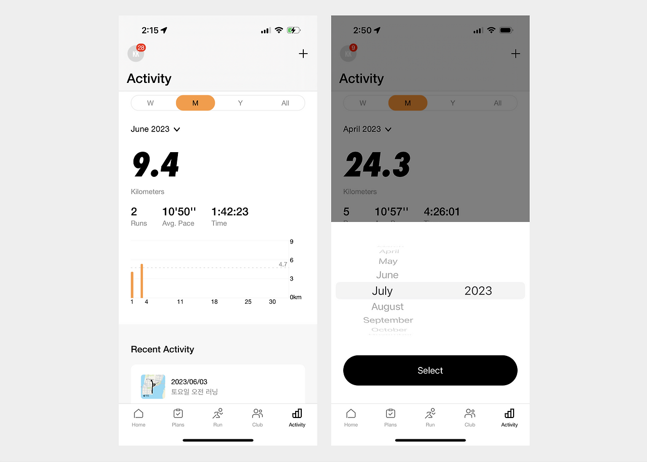 그렇게 조사를 하던 중 나이키 런 클럽 앱의 활동 통계를 알려주는 UX가 인상 깊어서 작성해 본다.