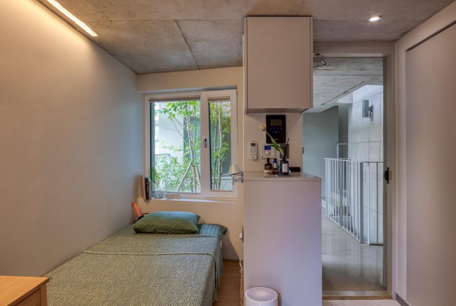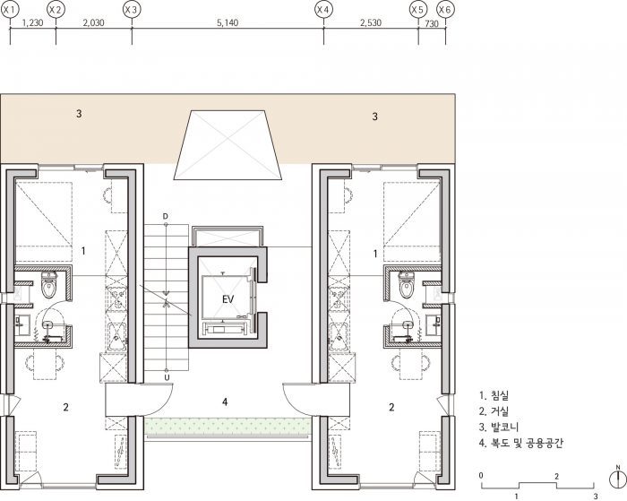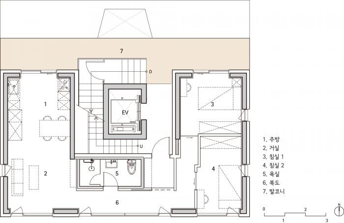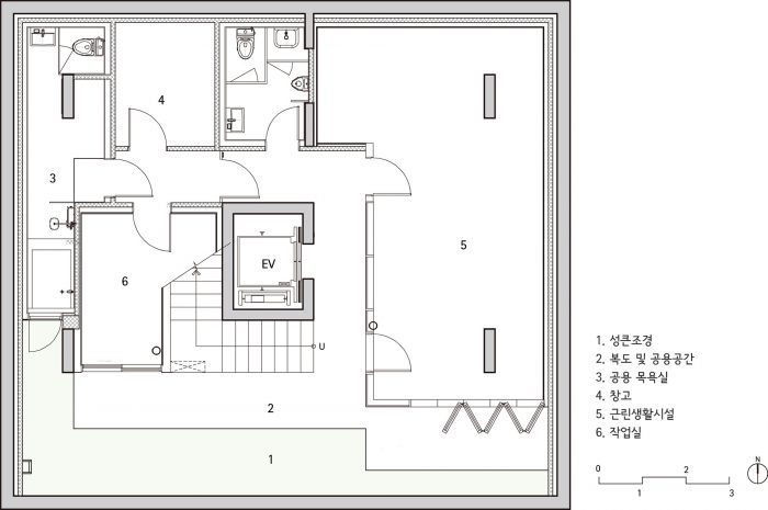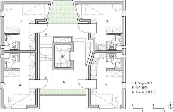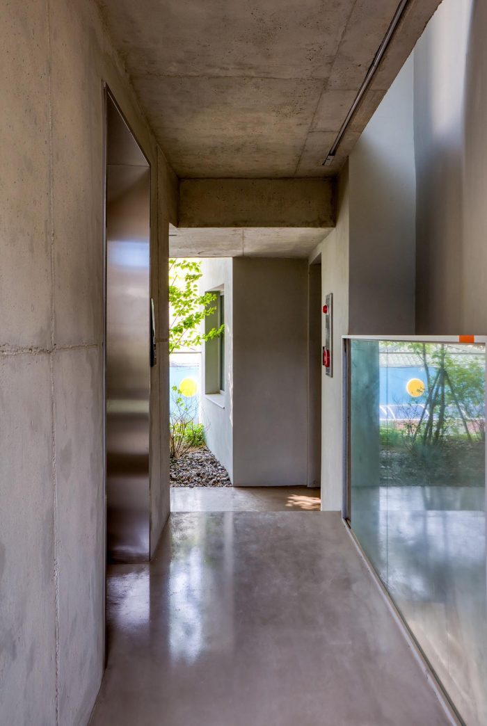 “유일주택은 전면과 후면이 각각 중정과 화단으로 개방되어 있을뿐더러, 위아래로도 뚫려있어요. 계단을 중심으로 층별 슬라브마다 오프닝이 배치되어 있고요. 엘리베이터 앞쪽 공간도 벽을 파는 동시에 위아래를 오픈했어요. 사실 굳이 엘리베이터 앞 벽을 파낼 필요는 없거든요. 다만 거주자분들이 느낄 시각적 답답함을 해소하기 위한 장치였죠.” – 최하영 건축가(마인드맵 건축 대표)