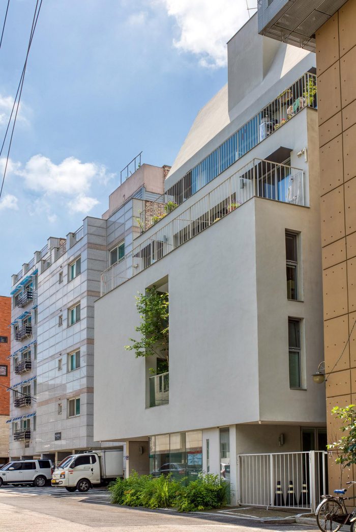 유일주택 파사드는 상당히 독특하다. 2층과 3층 전면부에 창문이 나 있지 않은 대신, 건물 전면 정중앙에 두 그루의 자작나무가 심어진 중정이 배치되어 있다. 중정은 유리나 창으로 막혀있지 않고 외부를 향해 뚫려 있다. 북쪽 도로에서 보이는 입면을 어떻게 구성할지 치열히 고민한 산물이다. 건물 전면부가 북향이라 4층과 5층은 일조권 사선제한에 맞춰 들어가 있으며, 별도의 테라스가 설치되어 있다. 유일주택 전면부 바로 앞 도로에서 건물을 쳐다보면, 바깥을 향해 가지를 드리운 자작나무의 푸르름에 가장 먼저 눈길이 간다. 여기에 건물 바로 앞뜰에 지피류로 조경을 하여 산뜻함을 더했다. 자칫 심심해 보일 수도 있는 아이보리 색 외장에 녹음이 어우러짐으로써, 한 번 보면 좀처럼 잊을 수 없는 건물의 얼굴이 완성되었다.