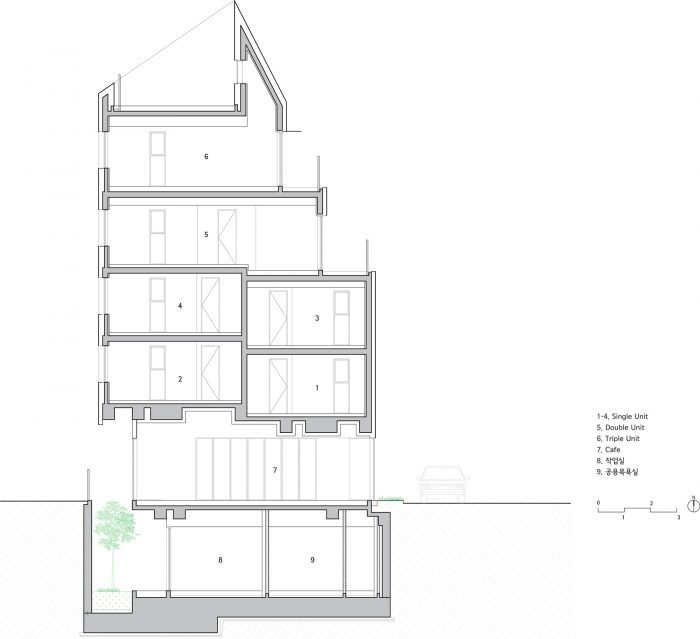 유일주택 2층과 3층에는 각각 네 개씩 총 여덟 개 원룸이 배치되어 있다. 4층에는 두 개의 1.5룸이 있으며, 5층에는 건축주 부모님이 거주하고 있다. 총 열한 가구가 함께 사는 유일주택에서 중정과 화단은 내부 조경 공간 이상의 의미를 지닌다. 일반적으로 다세대주택에서 계단과 복도는 독립적인 공간이라기보다 개별 가구 현관문으로 가는 과정에 놓인 통로 정도로 인식되어 왔다. 자전거와 택배 박스처럼 집에 둘 공간이 없어 바깥으로 나온 물건만이 복도와 계단을 내부 공간을 집의 공간으로 묶어줄 뿐이었다. 각자 따로가 아니라 함께 잘 사는 방법을 찾기 위해, 유일주택은 개별 공간을 조금 줄이더라도 공용 공간을 키우는 쪽을 택했다. 4층, 5층과 달리 2층, 3층에는 독립된 개인 테라스 공간이 없는 것은 그 때문이다.