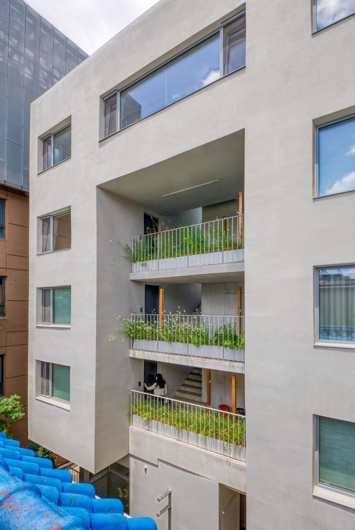 “거주자분들이 집 안에서 의자를 하나씩 가지고 나와, 복도 공용 공간에 머물러도 무리가 없는 분위기를 만들고 싶었어요. 복도와 계단을 넓힌 만큼 공간의 쓸모가 많아지기를 바랐죠. 북쪽 세대 중정에는 자작나무가 심겨 있고, 남쪽 층별 화단에는 지피류 위주로 심어 봤어요. 사람들이 저마다 키우는 화분이나, 허브 같은 작물을 층별 화단에 옮겨 심어 기를 수 있으려면 지피류처럼 조경에 여유를 줄 수 있는 식물이 좋겠더라고요.” – 최하영 건축가(마인드맵 건축 대표)