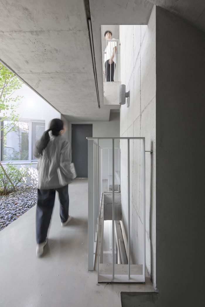 “남쪽 세대는 각 층의 두 집이 화단과 복도를 공유하는 형태예요. 본인이 원한다면 화단을 직접 가꿔볼 수도 있죠. 반면 북쪽 세대는 2층과 3층의 네 개 세대가 중정이라는 단일한 공간을 공유하고 있어요. 북쪽 세대와 남쪽 세대가 집 안에서 바깥을 바라보는 시선과 공용 공간을 사용하는 방식이 상이해지도록 신경을 썼어요. 입주를 염두에 두는 사람들에게 다양한 옵션을 주고 싶었어요. 무엇보다 사람들이 공용 공간에서 다양한 일을 할 수 있으면 좋겠더라고요. 공용 공간에 별도의 조명과 콘센트도 설치한 것도 사람들이 공간에 오래 머물 수 있도록 하기 위해서였죠.” – 박창현 건축가(에이라운드 건축 대표)