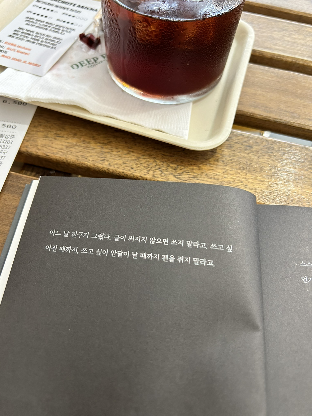 드립이라 시간이 필요한 커피를 기다리며 책을 꺼냈다. 서울도서전에서 처음 구입한 도서였다. “이 책 제가 쓴 책이에요.”라며 본인의 책을 한 장 찢어서 내어준 이가 썼다는 책. 그와 눈이 마주친 순간 느껴진 열감에 도망치듯 자리를 떠났었다. 결국 다시 돌아가 그의 책을 샀지만 말이지. 그의 일기장을 훔쳐 읽는다는 느낌에 읽기를 미뤄둔 책을 부산에서 읽을 줄이야. 인생은 알다가도 모를 일이다.