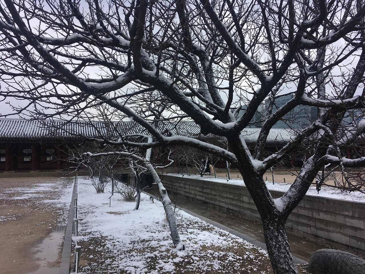 오늘은 눈이 온다. 눈 오는 경복궁이 생각났다. 취기를 짊어지고 초록색 7025번 버스에 올라탔다. 다행히도 환승 없이 한 번에 경복궁으로 쏜다. 버스 창 밖으로 흩날리는 눈 싸라기들을 보며 30분 정도 흔들렸다. 회색 성벽이 눈에 밟혔다. 보인다 경복궁.