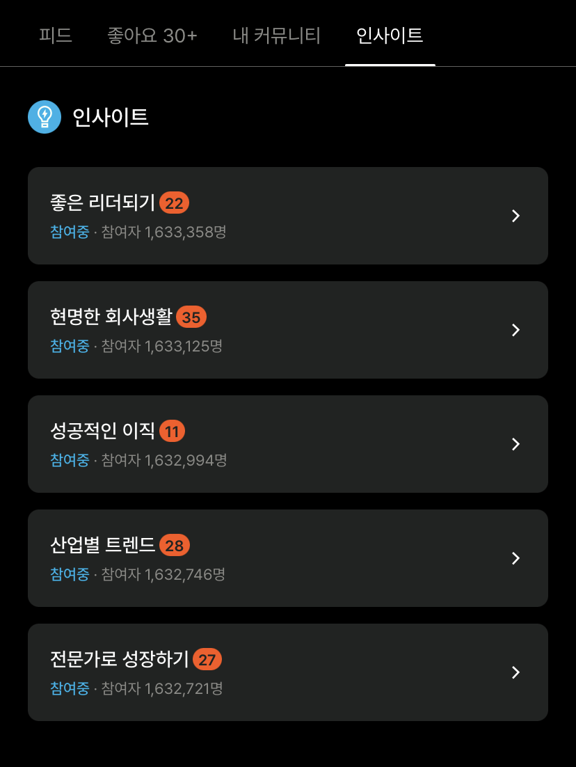 리멤버는 관심사로 카테고리를 묶어, 이야기가 오가게끔 유도합니다. ‘마케팅/PR/제휴’, ‘커머스/MD’, ‘기획/PM/PO’ 등 업무에 관한 주제는 물론 ‘주식/부동산/코인’, ‘이슈토론’, ‘취미/여행/운동’처럼 업무 밖 주제도 마련했어요. 카테고리는 고객의 관여도를 유지하는 데 도움을 줍니다. 고객이 모일 수 있는 명료한 테마를 제시하기 때문이에요. 아울러, 관련 카테고리를 한데 묶어 제안하는 모습은 영리하게 느껴지기도 합니다. 수십 가지 메뉴가 주어졌을 때 선택 불안을 겪듯, 다양성에는 분명 한계가 있을 수 있다는 까닭에서죠.