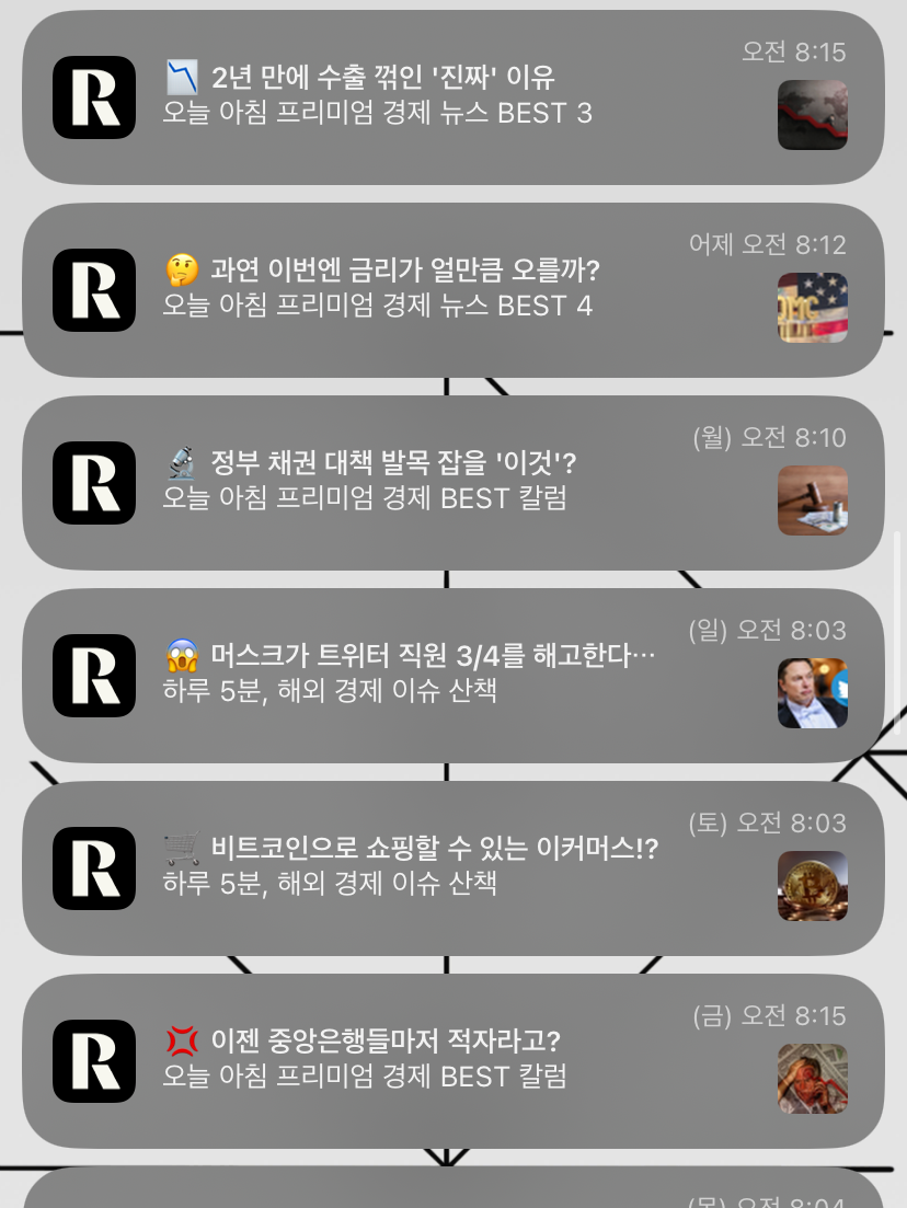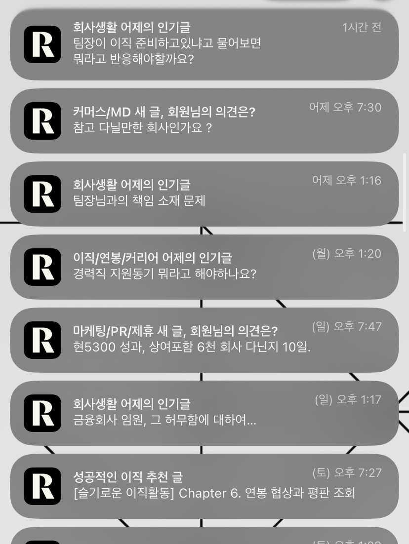 앱푸쉬가 ‘읽을거리’라면 어떤 내용으로 알림을 보내는지도 눈여겨봐야 합니다. 리멤버는 크게 ‘어제의 인기글’, ‘새 글’, ‘추천 글’ 등 3가지 유형의 게시글을 앱푸쉬로 소개하는데요. 인기글과 새 글은 오후 1시에, 추천 글은 오후 7시에 선보입니다.