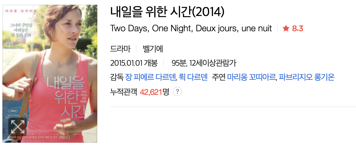 수업을 할 수 없게 되었다는 이야기를 듣고 제가 떠올린 영화는 다르덴 형제의 2014년 작, <내일을 위한 시간>입니다. 원제는 Deux jours, une nuit(Two Days, One Night)이지만 우리말로 번역했을 때 어떤 예능 프로그램을 떠올릴 수도 있겠다는 배급사의 판단에서 공모를 통해 정해진 한국어 제목입니다.