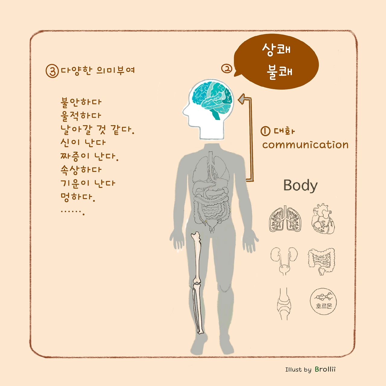 역시 보이지 않는 내부의 상태가 중요하다. 심장박동이 안정되게 뛰는지, 호르몬이 적절히 잘 분비되는지, 장기들이 제대로 작동하고 있는지, 이런 내부감각들의 느낌은 곧 정서의 바탕이 된다. 건강한 내부의 상태는 정서적 안정과 건강한 대인 관계, 의사 결정 능력에 기여한다. 속 편한 사람이 되기 위해 어떤 것들을 해야 할지는 브롤리의 그림책이나 연재들을 살펴보면 정보들이 곳곳에 있습니다.