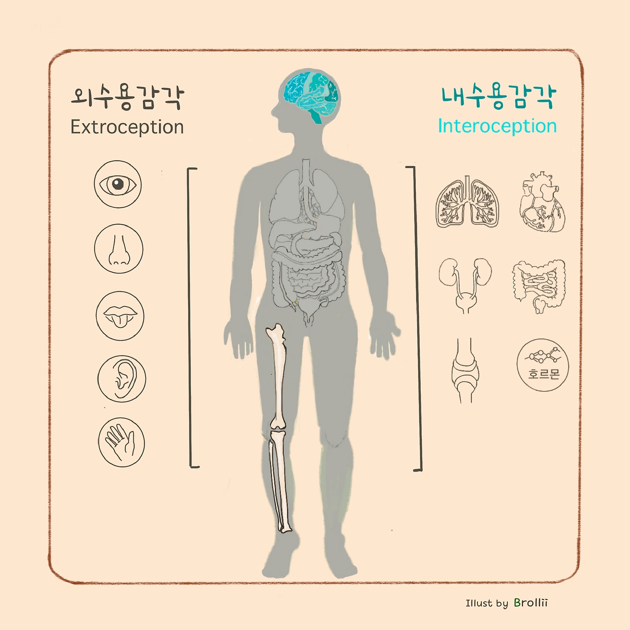 눈, 코, 입, 귀, 촉각 등 보고 듣고 느끼는 외수용 감각이 있고, 반대로 몸 안의 신호들을 파악하는 내부감각각인 내수용 감각이 있다.