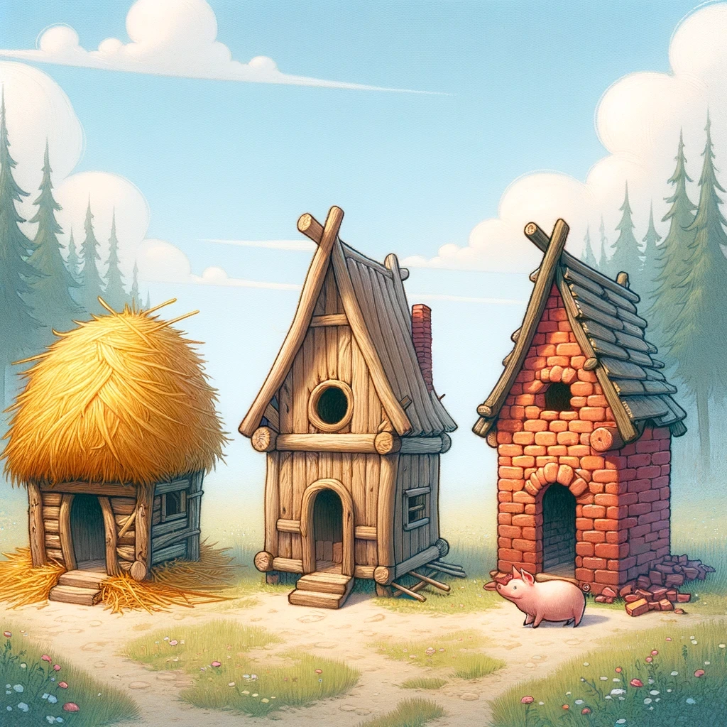 아기돼지들이 세상에 나와 집을 짓는다. 하나는 짚으로, 나무로, 그리고 벽돌로 집을 짓는다. 그러나 결국에는 짚과 나무로 지은 집은 늑대에 의해 부서지고 삼 형제는 벽돌집으로 모인다. 우리는 어린 시절 이 우화를 통해 수고롭고 힘이 들지만 집을 튼튼하게 지어야 한다는 것을 알고 있다. 튼튼한 집은 안전성을 보장받는다.