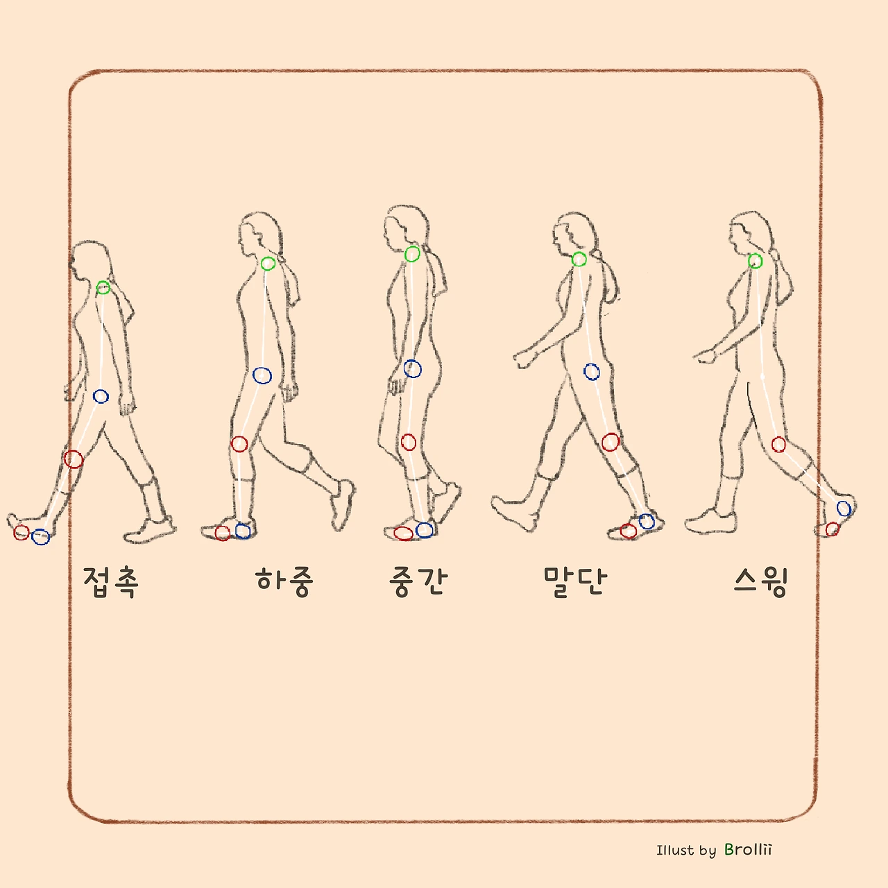 걸을 때 뒤꿈치를 시작으로 하중이 발의 외측으로 옮겨지며 무릎의 역할이 중요하다. 대둔근, 대퇴사두근, 발목 배 측 굴근은 실제로 충격을 흡수하는데 큰 역할을 한다. 아름다움뿐만 아니라 안정적이고 건강한 걸음걸이를 위해 대둔근(엉덩이근육)과 대퇴사두근(허벅지근육)의 발달도 중요해진다.