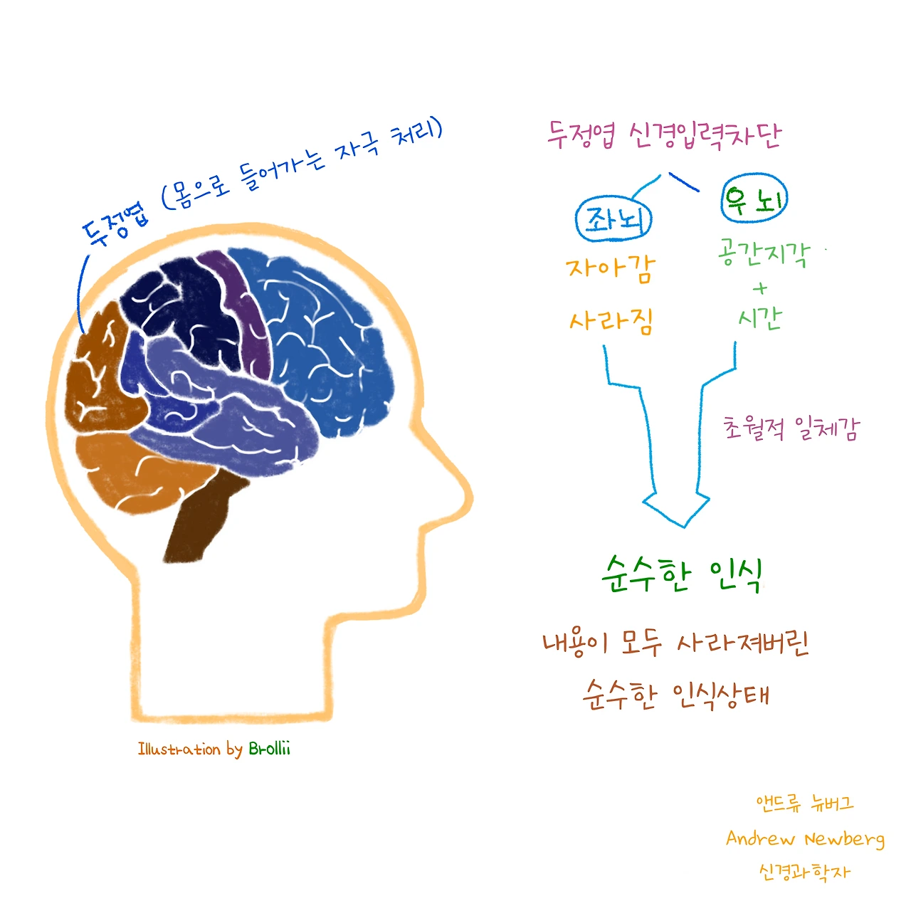 과거 명상을 시작하기 전에 뇌과학자가 바라보는 명상에 대해 조사한 적이 있었는데 “신경신학”(Neurotheology)이라는 분야를 개척한 ”앤드류 뉴버그(Andrew Newberg)”가 있다. 그는 신경과학적 관점에서 명상과 종교적 경험이 뇌의 기능에 어떻게 작용하는 지를 밝혀냈다.