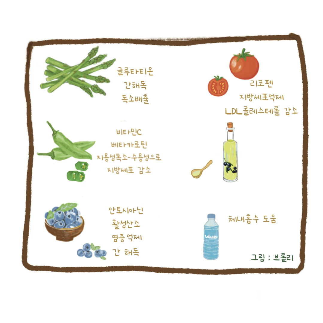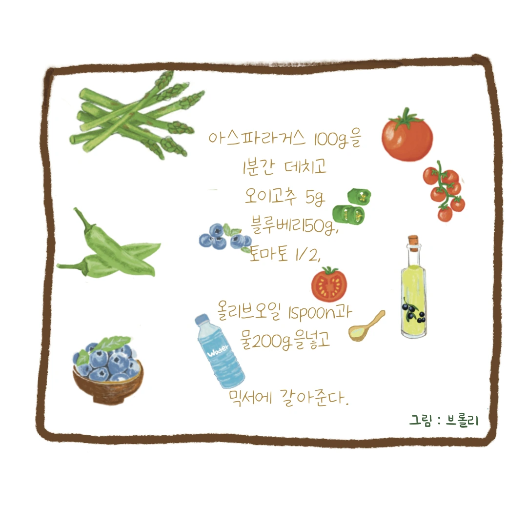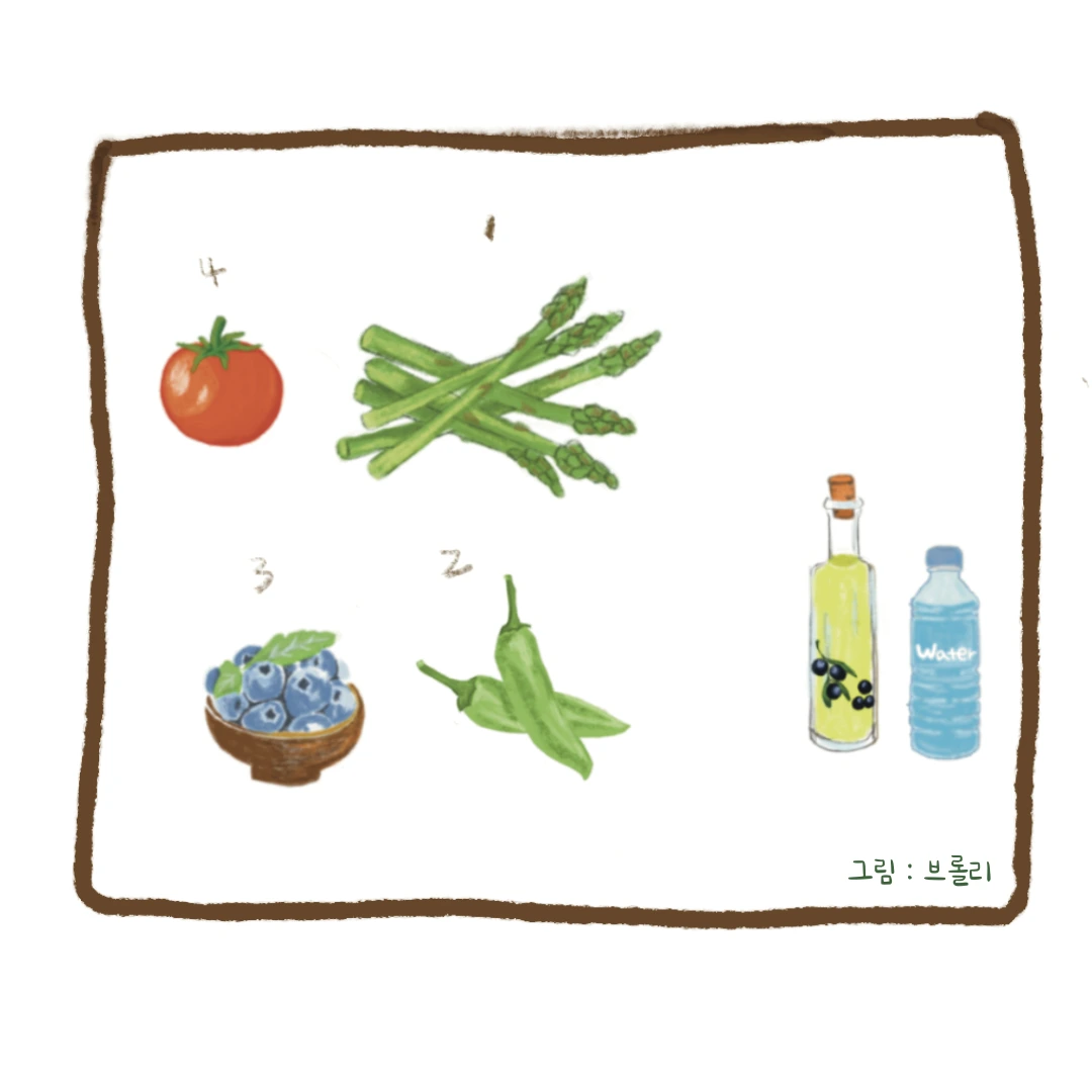 재료 : 아스파라거스, 방울토마토, 블루베리, 고추 약간, 올리브오일, 물