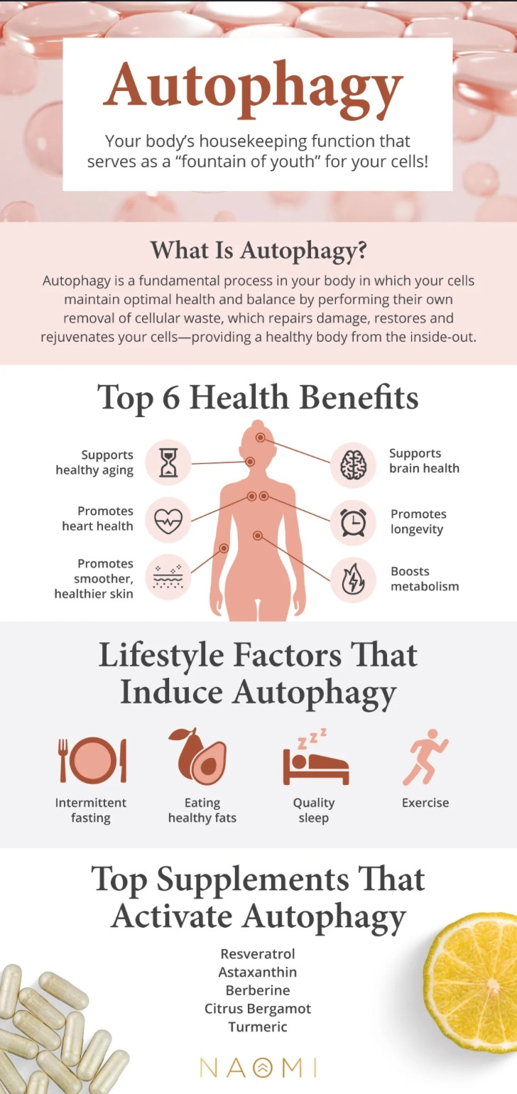 그 외 Autophagy로 누릴 수 있는 장점: 건강하게 나이 들기, 심장 건강 증진, 더 매끄럽고 건강한 피부, 두뇌 건강, 장수 촉진, 신진대사 촉진.