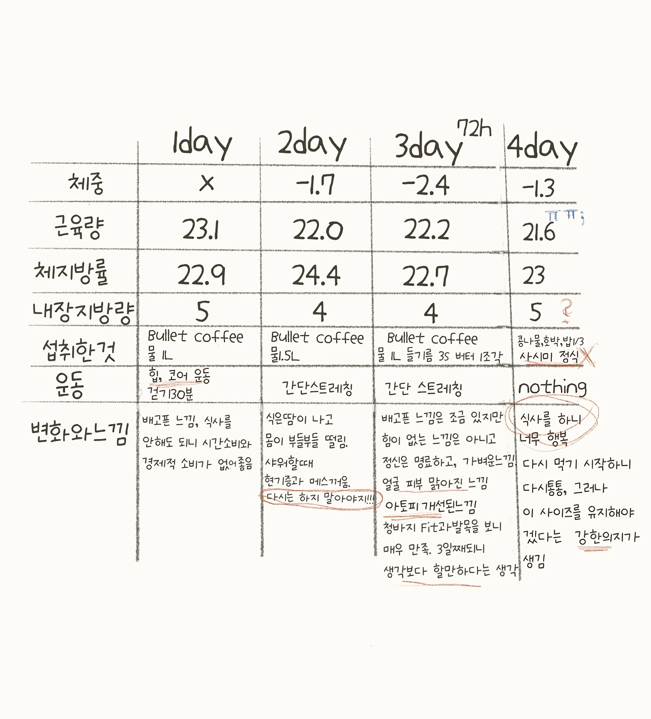 < 3일 단식과 그다음 날 현황>