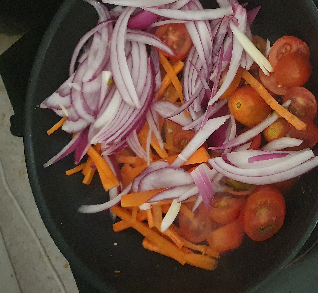 대개 적양파는 썰어서 발사믹 식초를 뿌려 매운맛을 잡지만, 오늘은 약간 따뜻하게 샐러드를 먹기 위해 양파와 당근과 토마토를 올리브오일에 살짝 볶는다. 집에 있는 과일들(사과, 배, 생밤)도 채 썰어 샐러드와 잘 섞이게 한다.