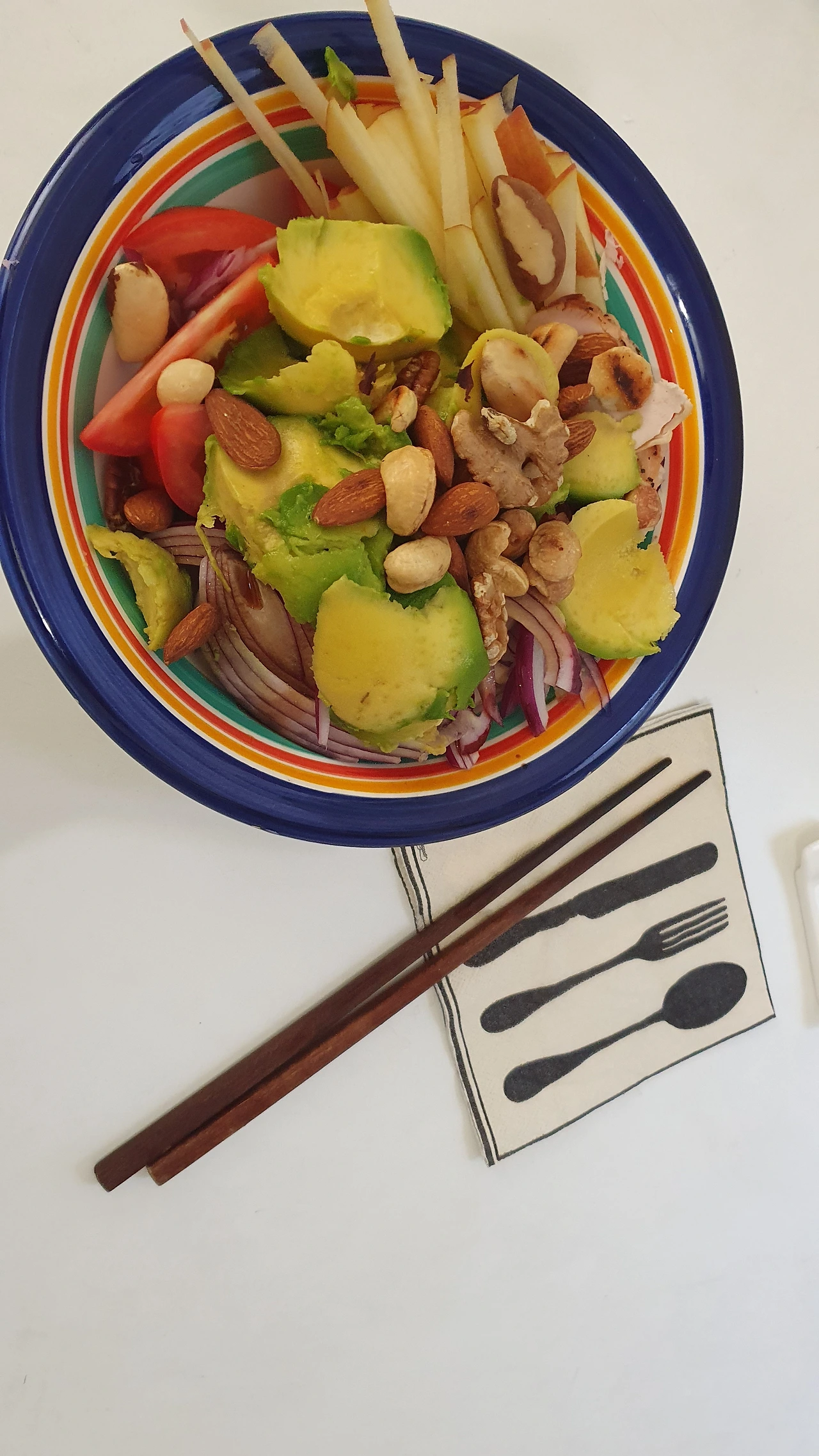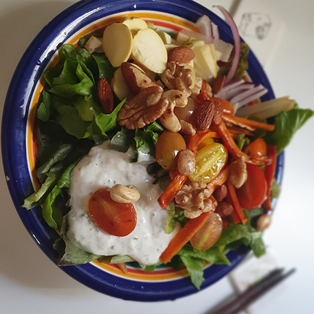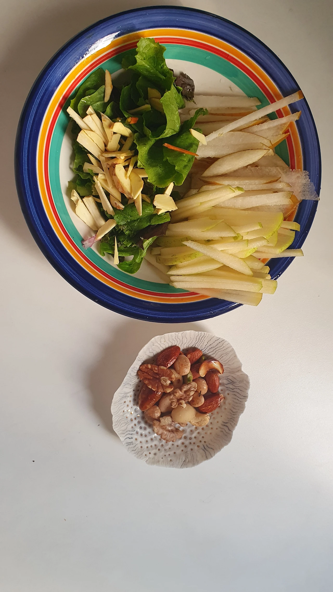 집에서 잘 먹지 않던 복숭아나 사과, 배도 얇게 썰어 샐러드 재료로 넣으니 덩달아 과일 소비도 늘어나고, 식사 후에 가벼운 느낌과 함께 식곤증도 없고, 배부르게 먹은 후의 불쾌감이 없어서 좋다. 야채 양이 풍성하고 견과류를 곁들이니 식사량도 맛도 만족스럽다.
