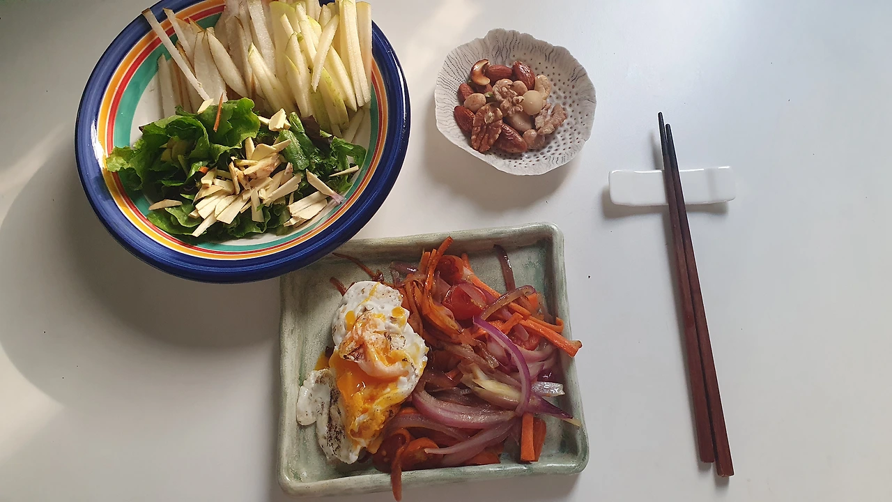 고기와 약간의 탄수화물도 가끔씩은 곁들여 주는데, 초록 이파리들, 토마토, 적양파, 견과류를 기본으로 한다. 추석 연휴에도 송편이나 전을 야채 위에 토핑 하여 먹었으므로, 여느 명절 때 보다 살이 적게 쪘고, 다시 원래의 몸무게로 돌아오는 것도 어렵지 않았다. (가운데 그림 오른쪽은 녹두콩과 당근을 올리브 오일을 두른 후 약불(인덕션 2~3단)에 한 시간 정도 익혀서 샐러드에 곁들임. 저수분으로 가열된 당근의 맛은 정말 환상이다.