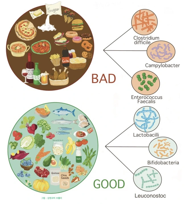 우리가 먹는 음식들은 유산균들의 먹이가 되고, 주로 소비하는 음식군에 따라 다른 종류의 균체들이 생겨난다. 아래 그림을 참조해 보자.