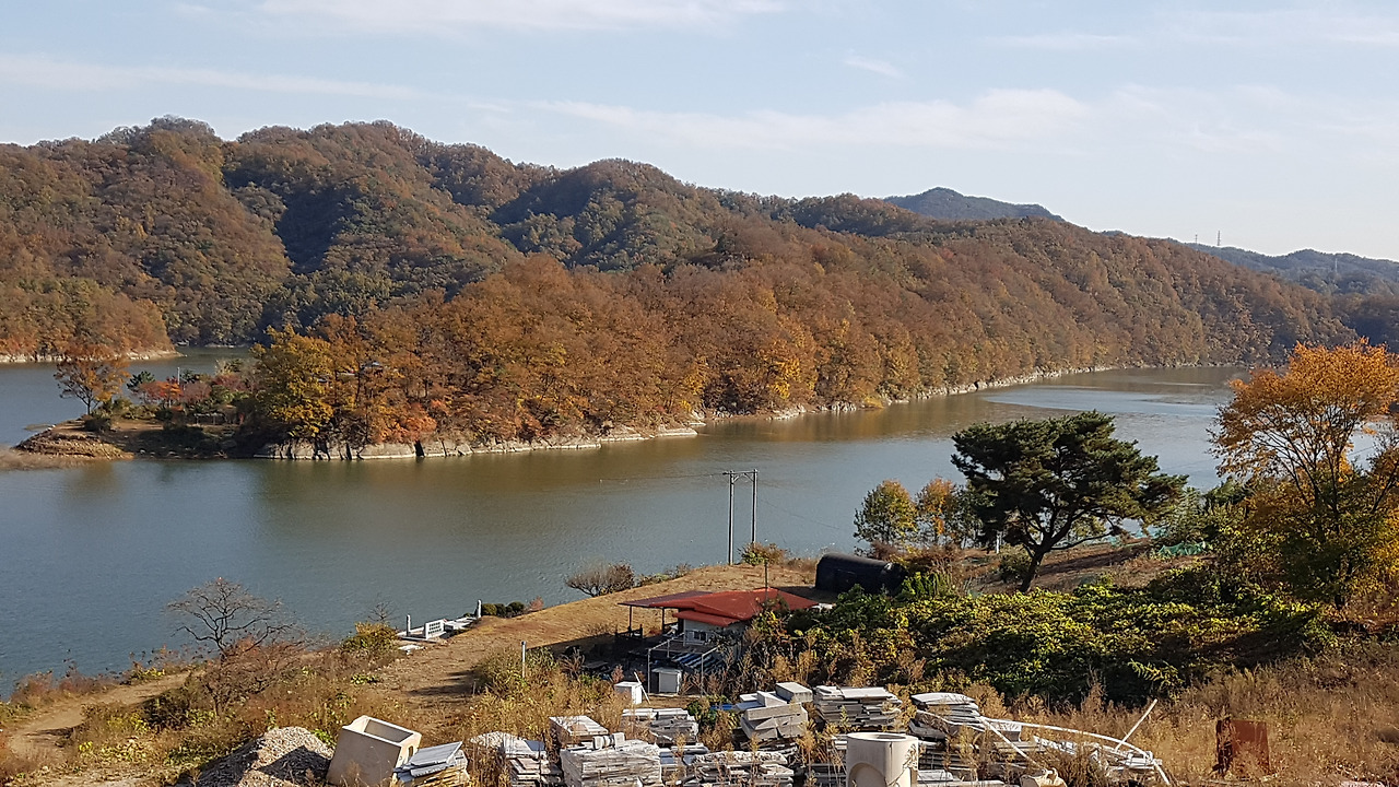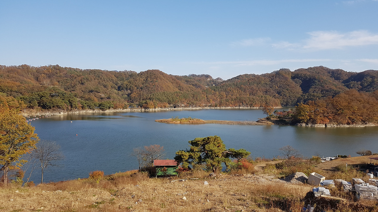 정자에서 바라보는 풍경은 양쪽이 달랐다. 호수 위에 길게 섬이 떠 있었다. 산 아래에 절리 같은 바위가 나란히 보였다. 마을이 수몰되고 산이 물에 잠겨 나무가 썩자 산 주인 일곱 명이 배를 타고 나무를 모두 베어냈다 한다. 썩은 나무를 끌어내리자, 자갈이 떨어지고 바위가 드러났다니 아름다운 풍광은 그저 생긴 게 아니었다.