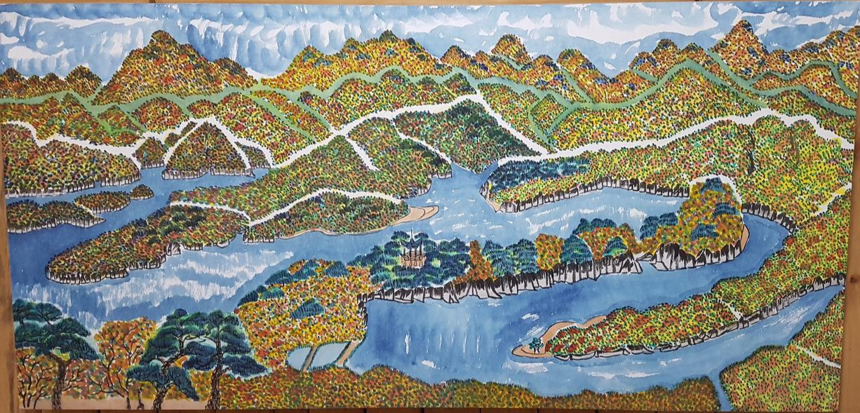 달리는 차 안에서 부소담악을 떠올렸더니 점묘화로 그린 그림과 병풍 같은 바위가 늘어선 호수가 뒤섞여 풍경을 보고 온 건지 그림을 보고 온 건지 어찔어찔했다.