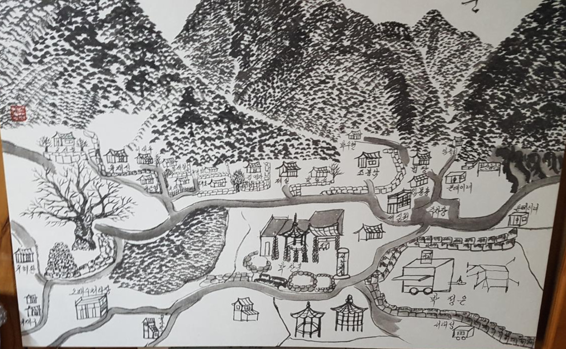 박찬훈 씨가 그린 마을 그림, 맨 아래 호수를 정원으로 둔 집만 특이하게 이름이 없다
