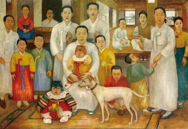 전시회에 입상도 하고 이름도 날렸지만 고향에는 갈 수 없는 신세입니다. 그는 사진과 기억을 조합해 서울 백인기의 가족을 그립니다. 가끔 화가들은 자기가 만나고 싶은 사람들, 머물고 싶은 공간에 자기 모습을 그려 넣곤 하죠. 아테네 학당의 철학자들 사이에 자신의 얼굴을 살짝 집어넣은 라파엘로처럼 배운성도 가족도에 자신을 넣었습니다. 그림 왼쪽에 하얀 두루마기를 입고 구두를 신고 서 있는 젊은이가 그입니다. 서울에서 키우던 개 한 마리도 그렸어요. 고마움을 그림으로 표현하고 싶었는지 모릅니다. 주인집의 도움으로 화가의 길에 들어서게 되었으니까요. 아니, 자신도 가족의 일원이라 여겼던 것 같아요. 그러고 보면 혈연으로 이어진 관계만이 가족은 아닌 것 같습니다. 함께 살면서 한 솥의 밥을 나누어 먹고 정을 주고받으면 사람이든 강아지든 모두 가족이 되는 게 아닐까요?
