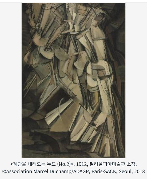 뒤샹의 초기 작품을 보지 못했더라면 ‘계단을 내려오는 누드’ 같은 작품을 이해하긴 어려웠을 것이다. 이 작품은 사진과 같이 인체의 세밀한 움직임을 표현한 작품이다.