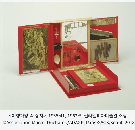 뒤샹의 작품은 모두 보존되어 있다. 복제품까지. 작품들로 만든 미니어처 같은 가방을 뒤샹이 아니라면 누가 생각해 낼 수 있을까? 원본이 자그마치 300개, 복사본이 400개라나. 뒤샹은 자기의 작품으로 프로포잘을 만든 거 같았다. 그는 작품을 만들기까지의 모든 메모와 그 메모의 복사품까지 만들어 보관했다. 그의 작품 대부분은 현재 필라델피아 미술관이 소장하고 있다.