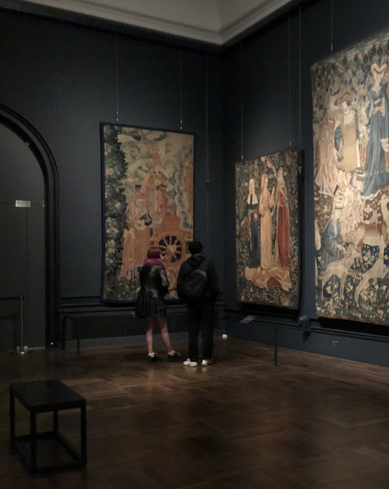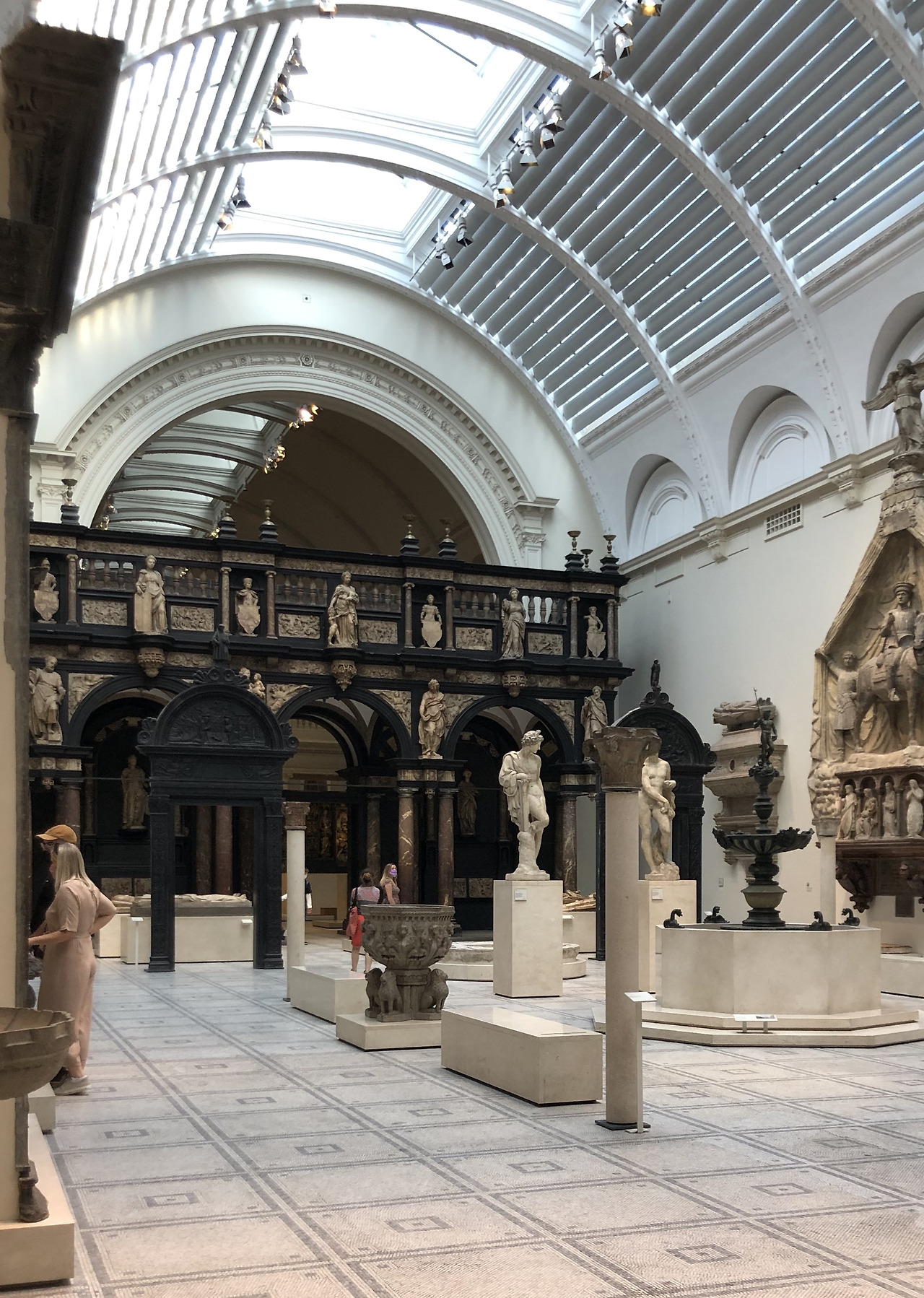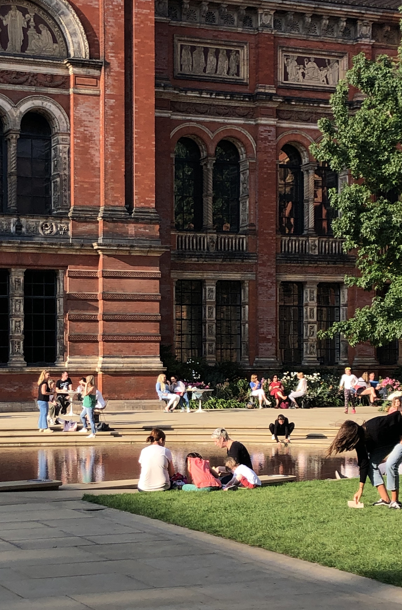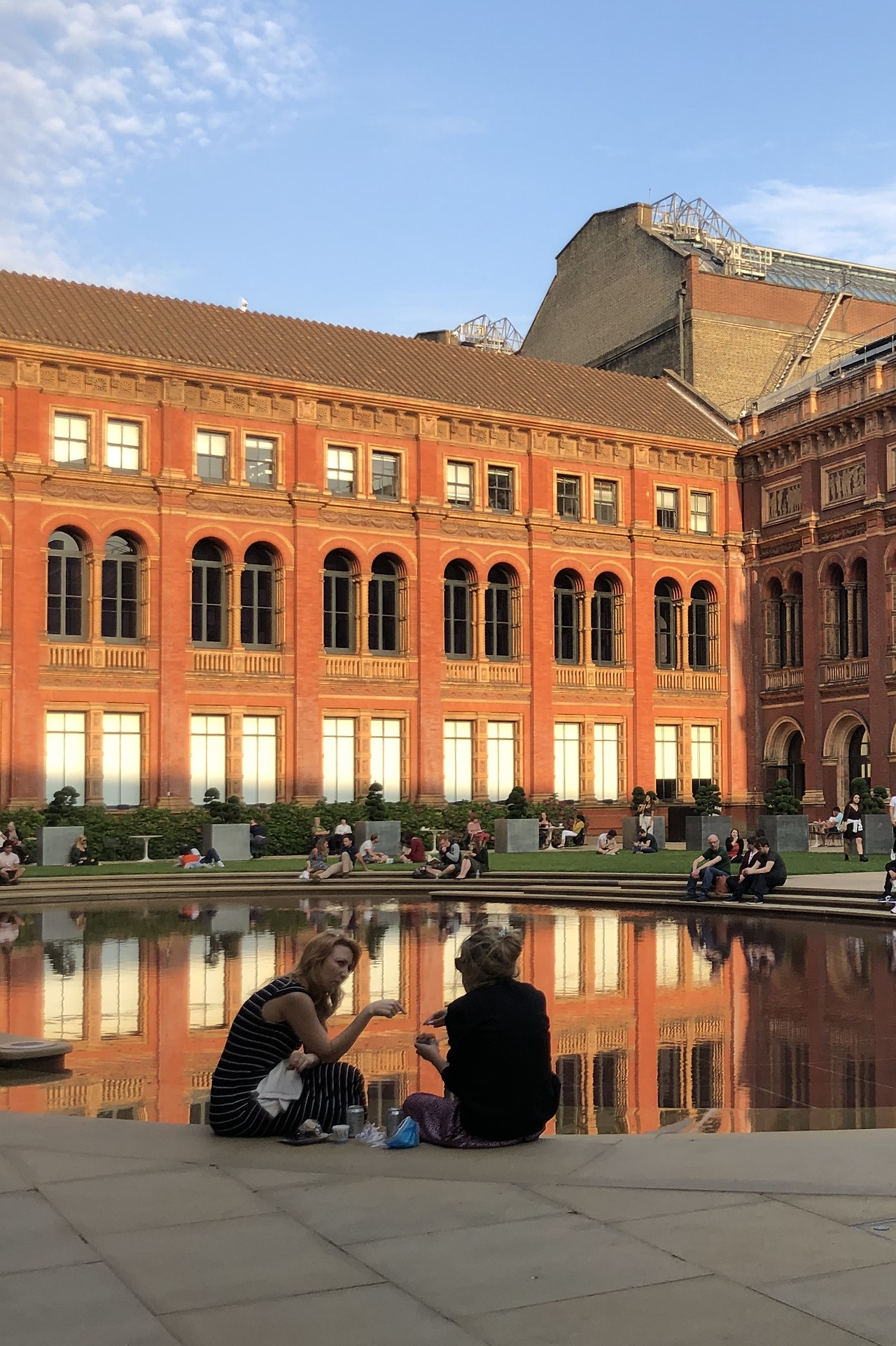하이드파크를 한참 걸어 피곤한 상태에서 들어갔는데, ㅁ자 구조의 미술관 한가운데 있는 정원이 내 피로를 녹여주었다. 벤치에 자리가 없어도 잔디밭이나 분수대 모서리에 철퍼덕 앉아 편하게 쉴 수 있는 곳이다. V&A 뮤지엄에 대한 첫 번째 기억은 쉼터였다.