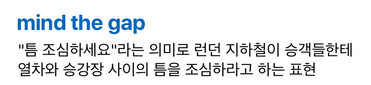 튜브를 처음 탔을 때도, 2년 가까이 이용하면서도 나를 놀라게 했던 gap이다. 제일 심한 경우에는 내 팔 길이만큼의 틈이 있었는데, 유모차나 캐리어가 있는 승객은 절대 내릴 수 없을 정도였다. 일단 저 문장이 들리거나 안내문이 보이면 조심하고 봐야 한다.
